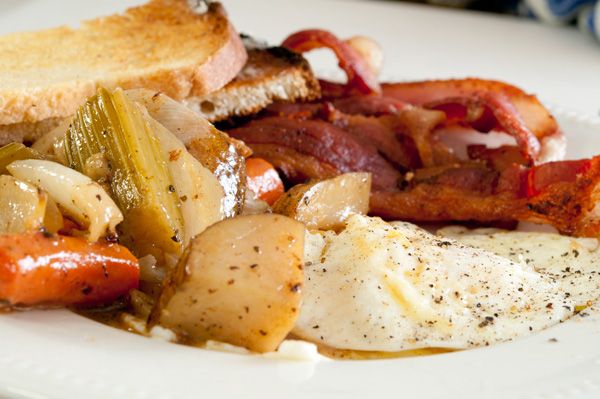 The stew has chicken chunks in it, I forgot about that, it's heated in the same pan that cooked the bacon. Oil removed, still a significant film remained, lifted off with sake and chicken broth and soy sauce until the vegetables heated through. The stew is already well flavored and now it is flavored again. Toast under the broiler because I don't feel like bringing out the toaster just for one slice.