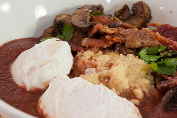 poached eggs, red wine sauce